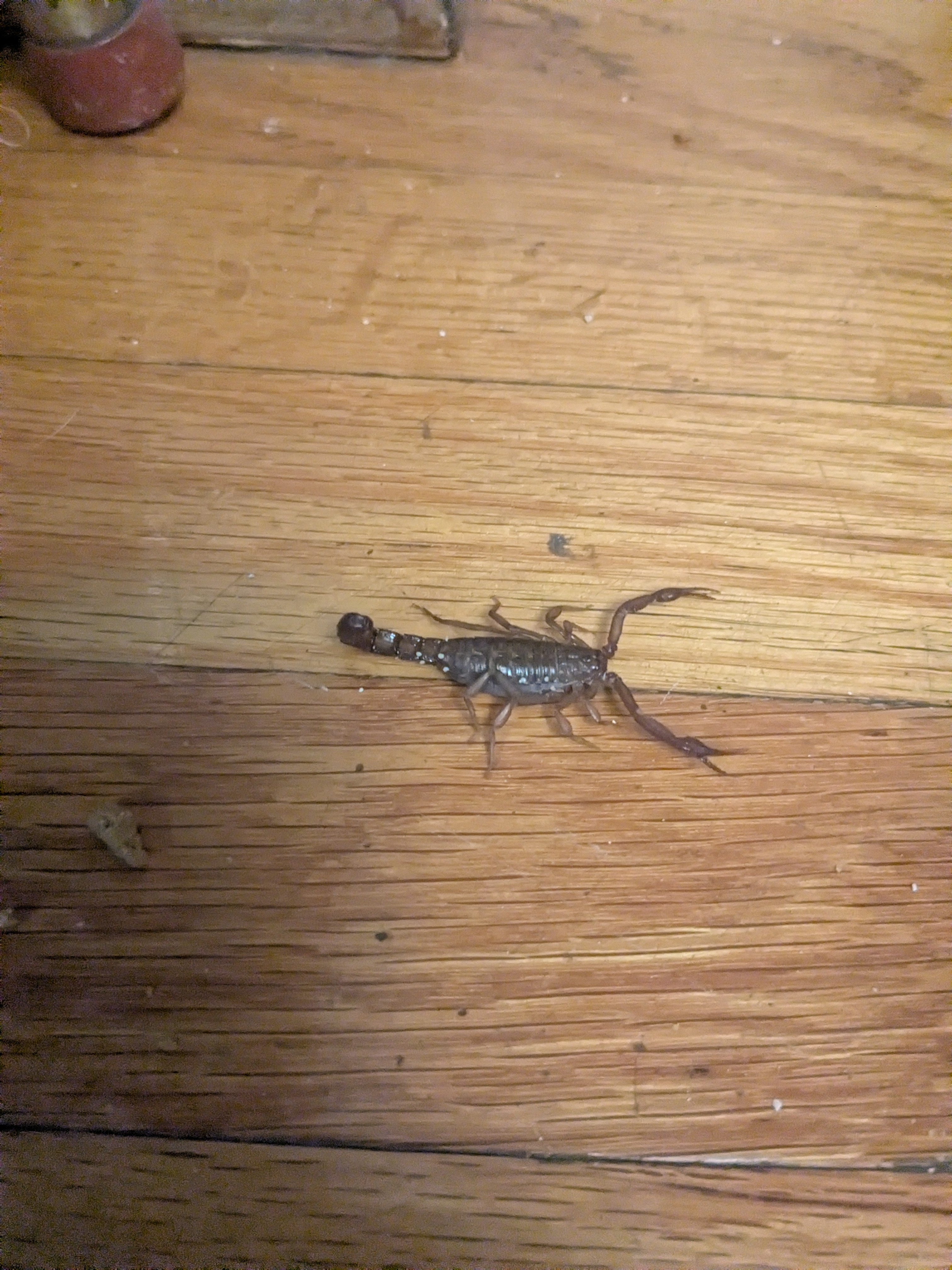 A moderately large scorpion. The dorsal surface of the cephalothorax, abdomen, and tail are dark reddish-brown, with obscure yellowish mottling but no pale stripes. The two species of Centuroides that have been recorded in North Carolina are yellowish to brown, with obvious pale and dark stripes on the dorsal surface (see key in Shelley, 1994).