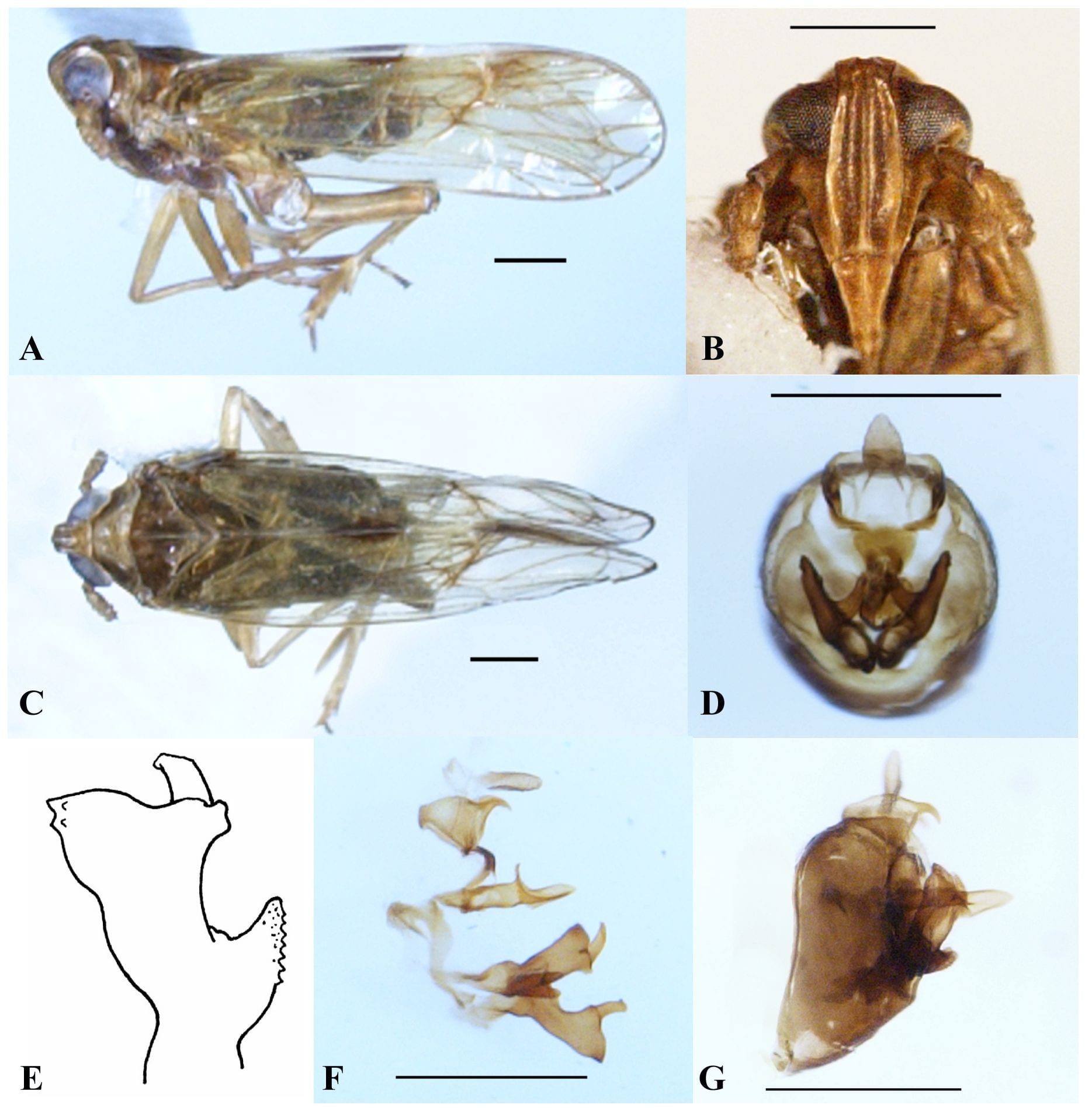 of a series of teeth on the first tarsal segment of the hind leg. New World Nilaparvata are externally quite similar and are best identified by their male genitalia, in particular the shape of the parameres and aedeagus." (