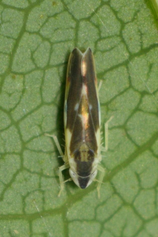 A very distinctive dark Erythroneura with an underlying yellow or white dorsum. There are two symmetrical blackish bands on the wings that connect near the base of the wings and extend to the tip of the head, forming a sharp dark point when viewed from above; the way these bands extend to the head is distinctive. The margins of the pronotum are a pale yellow color, distinctive for this species; the scutellum is entirely black. The sides of the wings have white, blue, and red markings bordering the main dark bands. The center of the wings has a white "four-petaled" pattern with a red dot in the center; the size of the white marks varies among individuals, ranging from large to nonexistent. The face and thoracic venter are entirely pale. Nymphs are yellowish overall. Adults are 2.7-3.1 mm long. (Dmitriev & Dietrich, 2007)