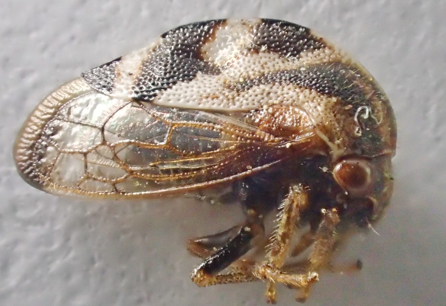 A brown to blackish species in which variation may result in individuals of each sex resembling the other. Males are dark, typically ranging from reddish testaceous to black, with prominent whitish vittae diagonally across the pronotum, with a thicker transverse band near the apex; the lateral margins of the pronotum closer to the head are also whitish. There is a prominent, clear hyaline patch on each side of the pronotum, above the vittae. The face is a pinkish testaceous color, and the underside of the body is black; legs are pale with the femora black above. The forewings are slightly enfumed, being dark fuscous at the tips. Females are yellowish to orange-brown, ranging to a dark brown color similar to some males, with whitish to yellowish-white vittae that are similar in extent to males; the central whitish line across the pronotum is edged with brown along the posterior margin. The tegmina is yellowish-hyaline with light brown tips. The underside of the thorax is ferruginous, the abdomen is flavous; the legs are yellowish with the femora marked above with brown. Adult males are 4-5 (up to 5.6 ) mm long, females are 5-6 mm and 2.8 mm wide. (Kopp & Yonke 1973) |