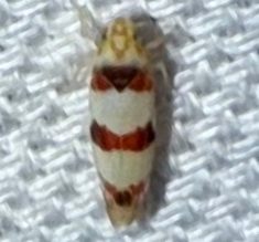 Yellow or white with a red, orange, or brown color pattern. The vertex has orange parallel submedial lines, and the vertex midline is pale; the face is also pale. The mesonotum is entirely dark. The underside of the thorax is entirely pale. The wings have 3 narrow red to black crossbands, with the basal one extending across the scutellum. The forewings have a dark spot on the costal margin.