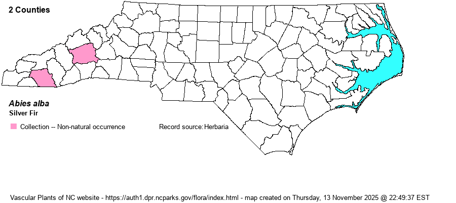| Identification | Weakley's key (2020) uses cone size to distinguish native from alien species. FNA does not treat A. alba nor A. firma in its key. Weakley's key states that leaves of juvenile plants of A. alba have blunt-rounded or retuse apex (vs. spinose-bifid in A. firma). | |