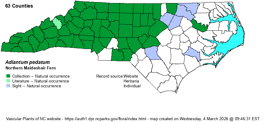 | Adiantum pedatum | > | Adiantum pedatum ssp. pedatum | Gleason and Cronquist (1991) | | | Adiantum pedatum | > | Adiantum pedatum ssp. calderi | Gleason and Cronquist (1991) | , misapplied to MD and PA material | | Adiantum pedatum | = | Adiantum pedatum var. pedatum | Fernald (1950) | | | Adiantum pedatum | < | Adiantum pedatum | | | | Adiantum pedatum | > | Adiantum pedatum | Flora of North America (1993b, 1997, 2000, 2002a, 2002b, 2003a, 2004b, 2005, 2006a, 2006b, 2006c, 2007a, 2009, 2010) | | | Adiantum pedatum | > | Adiantum pedatum | | | | Adiantum pedatum | > | Adiantum pedatum | | | | Adiantum pedatum | > | Adiantum aleuticum | Flora of North America (1993b, 1997, 2000, 2002a, 2002b, 2003a, 2004b, 2005, 2006a, 2006b, 2006c, 2007a, 2009, 2010) | , misapplied to MD and PA material | | Adiantum pedatum | > | Adiantum aleuticum | | , misapplied to MD and PA material | | Adiantum pedatum | > | Adiantum aleuticum var. aleuticum | | , misapplied to MD and PA material | | Source: Weakley's Flora |