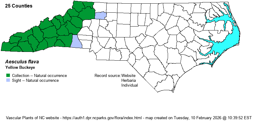 | Identification | Along with the Tuliptree (Liriodendron tulipifera), this is arguably the largest tree of cove forests, often reaching 90-100 feet tall or taller. This deciduous tree should be easily known to anyone who spends any time outdoors in the mountains. The leaves consist of five palmate leaflets, each leaflet being elliptic to oblanceolate and about 4 inches long. No other medium to tall NC tree has five palmate leaflets. The yellow to yellow-green flowers, conspicuous in spring, are quite large for a tree; they are in terminal panicles, with each tubular flower about 1-inch long. The fruit, often not seen, is a smooth and rounded capsule about 2-2.5 inches across. One could only confuse this species in NC with the Painted Buckeye (A. sylvatica), though that species is found in lower elevations in the Piedmont and is a small tree or large shrub. | |