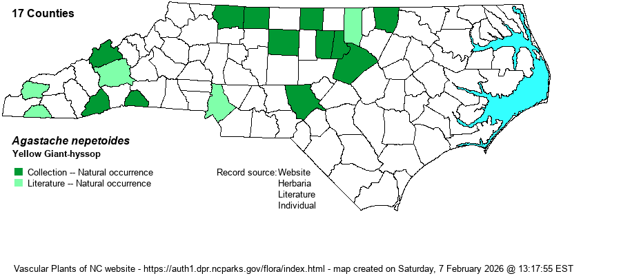 | Identification | This is a very tall, robust herb, often growing to 5-6 feet high and occasionally even taller. It has a square stem like about all other in the family, usually with a few upright branches in the upper portions. It has numerous opposite leaves that are ovate to almost triangular, with a short petiole, and with obvious serrations; each leaf is about 3-3.5 inches long and about 2 inches wide. At the top of the stem and each branch is the flower cluster of about 4-5 inches long, a very dense "spike" of light yellow to creamy yellow flowers, each only about 1/5-inch long. Even though the flower color does not stand out at much distance, owing to the green color of the calyx and many bracts in the cluster "swamping out" the corolla color, the erect "candles" at the tips of branches are quite noticeable, especially where several to many plants grow together. The other species in the genus in NC -- A. scrophulariifolia -- is quite similar and should only be safely identified by range or when in bloom; it has pink or light pink to whitish flowers, and is essentially limited to the mountains. | |
