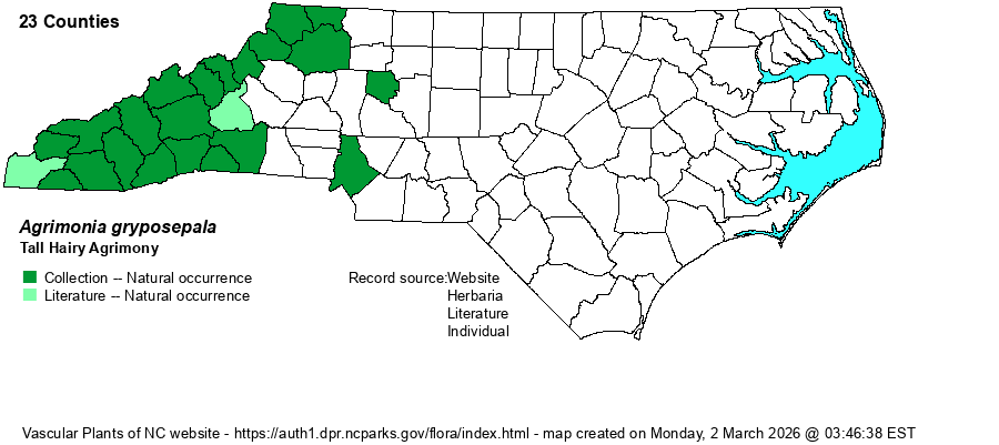 | Identification | The genus Agrimonia has numerous species with distinctive leaves and flowering stalk, but the characters to separate many are quite technical, and biologists may have trouble keying them out. All have erect stems ranging in the vicinity of 3 feet tall, with alternate leaves that are distinctly pinnately compound, with small leaflets intermixed with much larger ones. Also, the inflorescence is a very long and slender spike-like raceme of tiny yellow flowers; these plants should be easily identified to genus level. In this species, the stem is stout and may reach up to 4 feet tall. This and several other species -- A. rostellata, A. striata, and A. parviflora -- all have glistening glands along the stem and axis of the raceme. This species and A. rostellata have these glands short stalked (use a hand lens), versus all glands sessile in the other two species. This species, being robust, has the stipules at the bases of the leaves quite large and leaf-like, about 1/2-inch long, and cordate at the base. Its large leaflets are rather long and sharply serrated, elliptic, and about 3 inches long; and there may often be two pairs of small leaflets between larger ones. A. rostellata, which also occurs in the mountains, is a smaller species, reaching about 3 feet tall, but its leaflets are more obovate (rounded), with smaller teeth, and there is almost always just one pair of small leaflets between the larger ones. Note that the equally robust A. parviflora has 11-15 large leaflets (that is, 5-7 pairs plus a large one at the end); all other NC species have only 9 or fewer large leaflets (4 pairs or fewer, plus the terminal one). | |