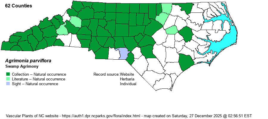 | Habitat | This is essentially the only Agrimonia that favors wetlands. It grows in rich soil of bottomland forests, swamps, marshes, wet thickets, and wet meadows. It favors some light gaps in forests and is not normally seen in deep shade. It also prefers higher pH soils. | |