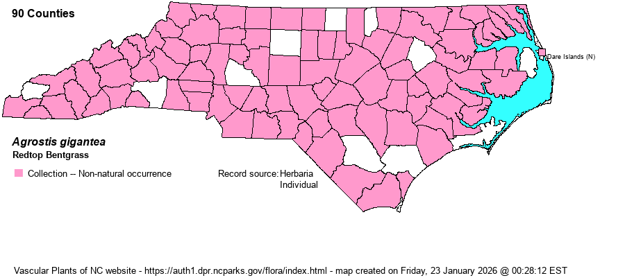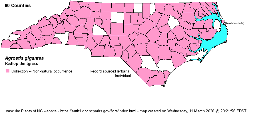 | Identification | Redtop Bentgrass is our tallest bentgrass, reaching 3-4 feet, but often much shorter. Like A. stolonifera and A. capillaris, it has a palea at the base of the lemma. From capillaris it differs in its longer ligule on stem leaves (2-7 mm long vs. less than 3 mm long). From stolonifera it differs in not having surficial stolons (vs. stolons present), possessing rhizomes (vs. absent), and having a more open panicle. | |