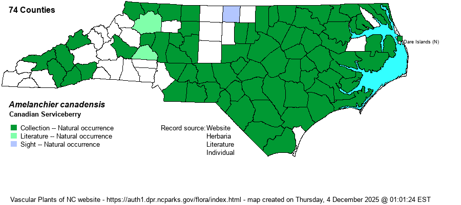 | Abundance | Infrequent to fairly common in the Coastal Plain, but rare to uncommon in the lower Piedmont. Generally rare in the remainder of the Piedmont and lower Mountains. Typically much less commonly seen than Coastal Serviceberry (A. obovalis) in the Coastal Plain, and certainly less often seen than Downy Serviceberry (A. arborea) in the rest of the state. | |