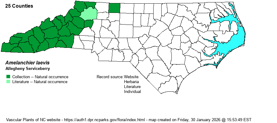 | Identification | This is a small deciduous tree, growing mostly to about 20-30 feet tall, much shorter than the closely related A. arborea. It also generally has several stems, as opposed to that species, which has a single trunk. Additional characters to separate it from A. arborea include hairless leaves, reddish or purplish tinge to new leaves, and a sweeter fruit; the latter species has quite tomentose leaves. Note that A. laevis is quite similar to A. canadensis and A. intermedia in growth form (and the latter two can occur in the mountains), but the first species has drooping inflorescences, petals at least 1/2-inch long, and grows in dry or rocky uplands, mostly at higher elevations; the latter two are wetland species with erect inflorescences and have petals less than 1/2-inch long. | |