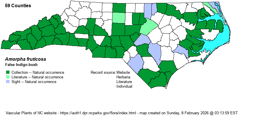 | Identification | This is, by far, the tallest species of indigo-bush (Amorpha) in the state, typically averaging 5-10 feet tall. It has deciduous leaves, which consist of 9-23 leaflets, each about 1 inch long and generally not shiny above. The stems are usually quite pubescent. It is best identified by its large stature –- usually over knee height, the relatively large leaflets, and its bushy look, with widely spreading branches. The flowers are rich violet to purple, which can also be useful in identification. Also, it is usually the only indigo-bush growing on alluvial soils of river banks, marshes, and pond margins. | |
