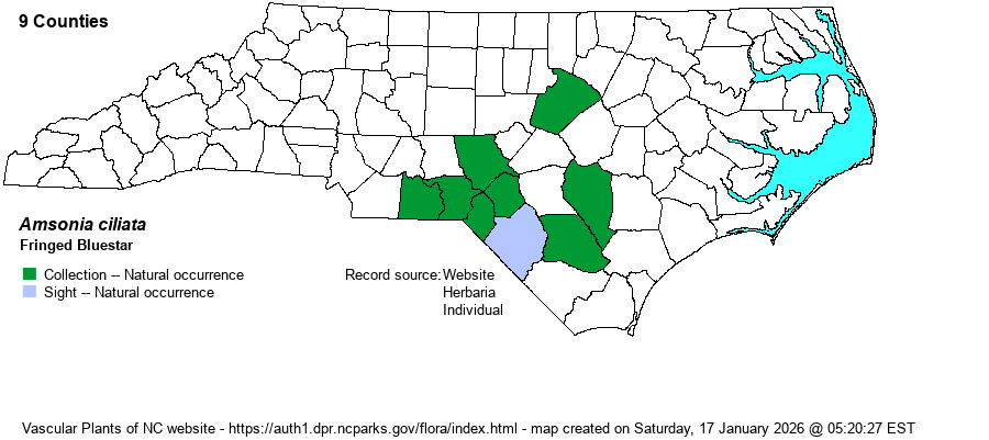 | Identification | This is an herbaceous species with often multiple stems, growing to 1-2 feet tall; a stem may have a few short branches in the upper portions. The stem and leaves are quite hairy. This species has a very large number of alternate leaves, each being very narrow and ascending (or gently arcing away from the stem); they average about 2-3 inches long but only about 1/4-inch wide. No other sandhills plant really looks like this one, with its many needle-like and ascending leaves, but in bloom it is quite striking. The flowers grow in a terminal cluster (at the end of the stem or branch) a few inches across. Each flower is pale (Carolina) blue, star-shaped, and about 3/4-inch across, with a slender pale blue tube at the base of the flower. Though a single plant in bloom is quite showy, thankfully the species usually grows in small and dense patches, and thus such a patch can be seen by an observer for many hundreds of yards across its dry sandhills habitats. In fall, the paired fruits are erect, very long and slender, growing about 5-6 inches long. This species had long been on the NCNHP Watch List, but enough recent records had been made to remove it from that list. It is certainly not seen on every walk in the sandhills, and it may take a handful of walks to find it, but a biologist working that region should see it from time to time in a given year. | |