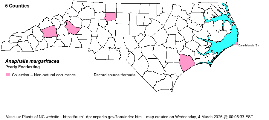 | Identification | Pearly Everlasting is similar to members of Pseudognaphalium and less so to Gnaphalium. The stems are 1-3 feet tall, whitened with dense tomentum. The leaves are broadly linear, dark green above and white beneath. The inflorescence grows atop the stem in corymbs or panicles, the heads globular, flower bracts bright white, the rayless florets dull yellow -- producing an "interesting" look in bloom -- like a small bright white ball with a yellow cap. | |