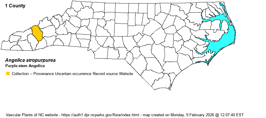 | Distribution | Collections from Haywood and Buncombe counties, and a sight report from the Doughton Park area (Alleghany or Wilkes counties) in the NCNHP database. However, as this is a Northern species, with no records for VA and unverified report(s) for eastern TN (Guide to Vascular Plants of TN, 2015), it has often been considered as probably not native in NC. In addition, the collections are historical, but the sighting -- if correct and apparently from a roadside -- is more recent. However, since there are no VA records and Doughton Park lies close to the VA border, the editors are considering this report as a likely misidentification and thus is not mapped below. Also, the Buncombe specimen is from "Biltmore" in 1899, and thus it could have been planted/cultivated at that site. The editors are being conservative and will remove that county from the map. There is a specimen from Ashe County (Culwell 558 UCAC) but is misidentified. In Haywood County there are 3 collections, from 1958, 1966, and 1975, from 3 different locations, which suggests it was well-established.