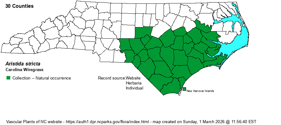 | Other Common Name(s) | Traditionally called just "Wiregrass" in the Carolinas, and that is a suitable name in use here. As A. floridana is generally called Keys Wiregrass, and A. beyrichiana is often called Southern Wiregrass, Weakley (2025) and a few other references, including this website, will use a modifier name -- Carolina Wiregrass -- especially as this locally abundant and characteristic species is -- surprisingly --limited just to NC and SC. Also named as Pineland Three-awn by some references, but that includes additional taxa. | |