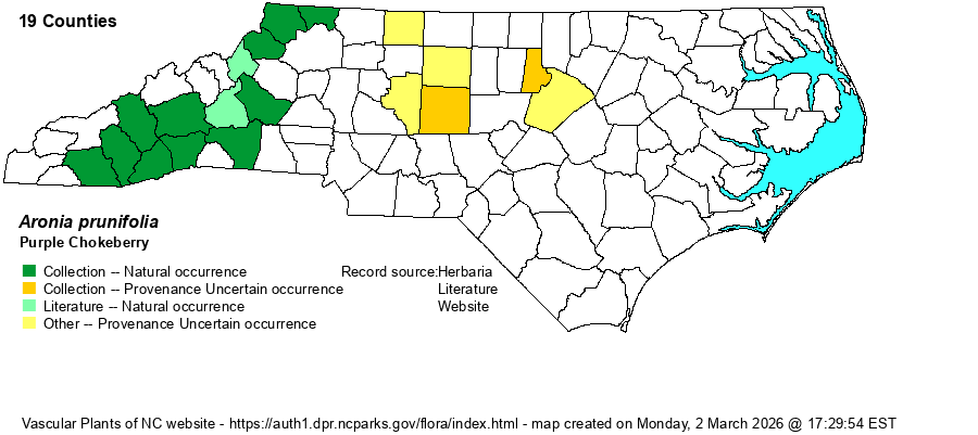 | Abundance | Uncommon or occasional in the Mountains, but it is suspected that it is mostly overlooked if not in fruit, as some references do not treat this as a valid or full species. Presumed to be very rare to rare in the Piedmont, and of uncertain provenance. Nonetheless, it is certainly rarer than the other two chokeberry species in the state. This is an NC Watch List species. | |