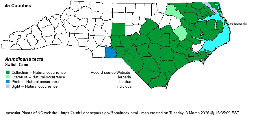 | Identification | This is the only native cane that grows in blackwater systems of the Coastal Plain. It typically grows to 3-6’ tall, rarely to about 10’ high. It is semi-evergreen; the leaves typically remain on the plants over the winter, though the plants are much “lusher” in the growing season. W. Cook, on his Carolina Nature website, says that “Unlike Giant Cane [A. gigantea, strict sense], the stems [of Switch Cane] are too thin and delicate to be used for fishing poles.” For other distinctions in separation from A. gigantea, see Weakley (2018). See also the account for the alien Pseudosasa japonica. | |