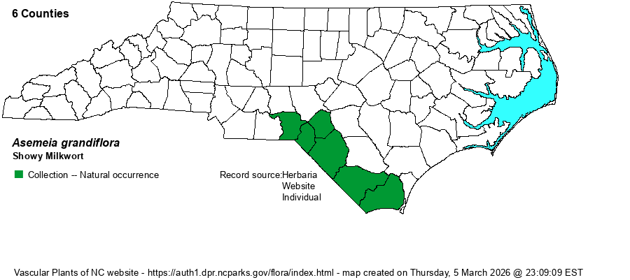 | Distribution | Essentially in the southern half of the Sandhills region, but present eastward into the middle Coastal Plain in Robeson County, and disjunctly to southern Columbus County and a recent specimen from Brunswick County (NCU). Not yet known from northern Sandhills counties -- Moore, Harnett, and Cumberland.