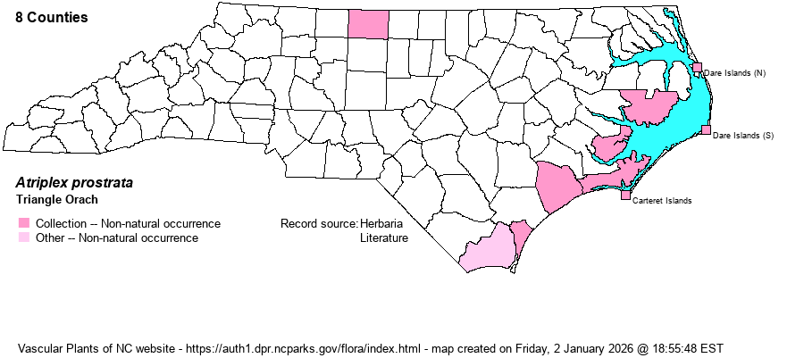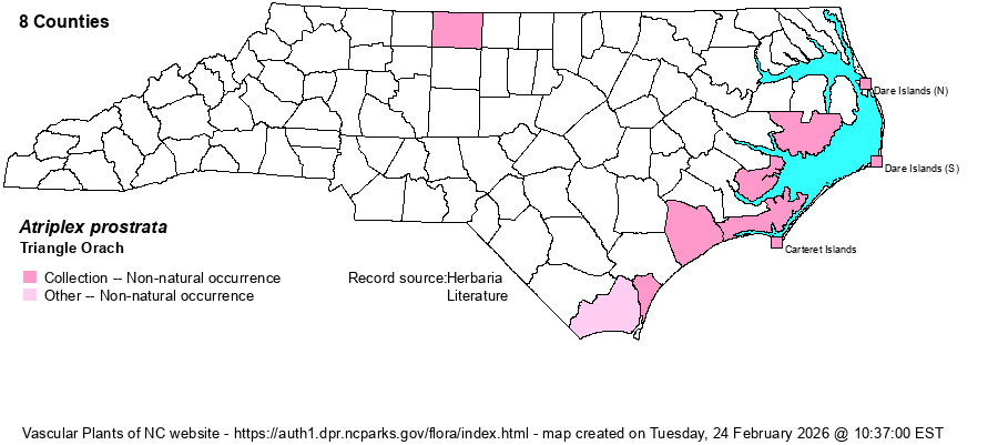 | Distribution | Coastal; believed to be not native in the eastern U.S., and possibly not even native at all in North America. Definitely Eurasian in native origin. The Rockingham County collection is from a railroad track in Reidsville. Weakley (2024) treats the species as non-native in the Southeastern states. Named as Atriplex patula in RAB (1968).