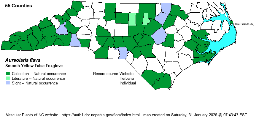 | Distribution | Throughout the Mountains; scattered over most of the Piedmont, though scarce in some areas; very widely scattered in the Coastal Plain, with many gaps in the range. Thus, broadly statewide in overall range. For what it's worth -- the great majority of photos on iNaturalist are of other Aureolaria species and rightfully have not been vetted; perhaps the program's suggested species needs refining.
