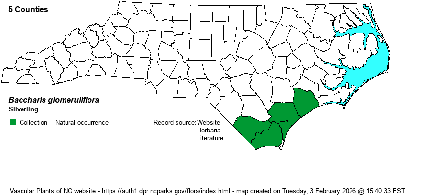 | Identification | This is a small evergreen shrub that grows only to 3-6 feet tall. The leaves are small, mainly 1-1.5 inches long, light green and a bit glaucous, and are wedge-shaped, widening from a tapered base to show several serrated teeth at the broad tip. Though the leaves are fairly similar to those of the abundant B. halimifolia, B. glomeruliflora is separated from the other by its flowers in small clusters growing in axils along the stems, rather than solely near or at the tips of the branches. Thus, an observer seeing the species will note the creamy-yellow flowers or fluffy white fruit coming from all over the stems of this smaller shrub and not just around its perimeter. Its small stature might also be notable to an observer, especially a Baccharis shrub in bloom or fruit under 5 feet tall. Few biologists in the state are familiar with it in the Southeast, and thus it likely can be or will be overlooked by most people. | |
