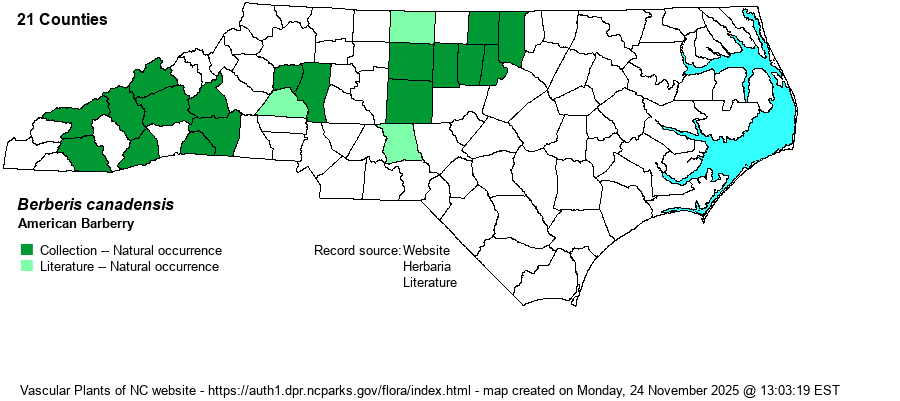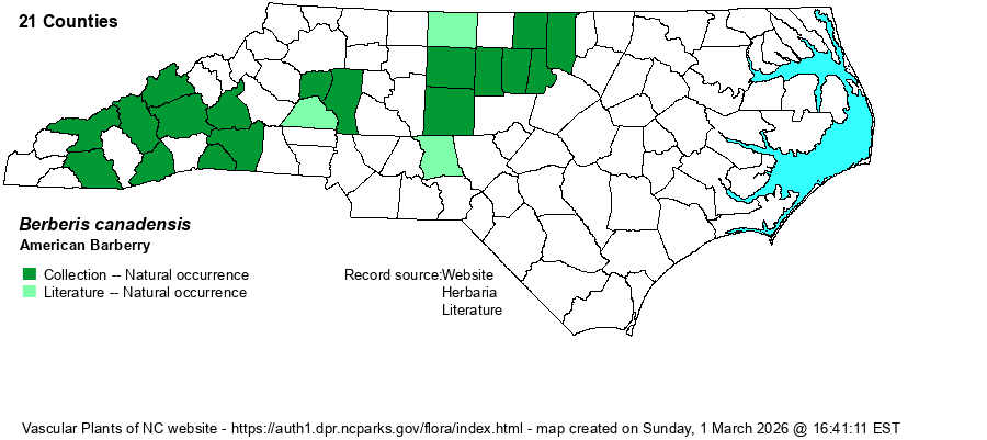| Abundance | Rare in both the Mountains and Piedmont. Surprisingly very rare or absent from the northwestern portion of the state. This species, as do other barberries, serves as an alternate host for wheat rust. In some parts of the range this has led to physical eradication of the shrubs, though this might not have been the case in NC, at least not in recent decades. It is a State Special Concern species. | |