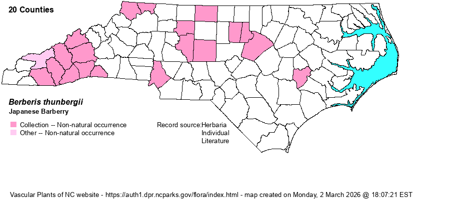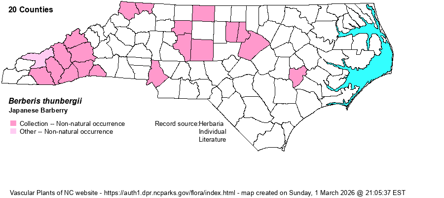 | Distribution | Mostly the Mountains and Piedmont; also Lenoir County. Collections from Avery, Rowan, and Wilson counties appear to be cultivated plants.