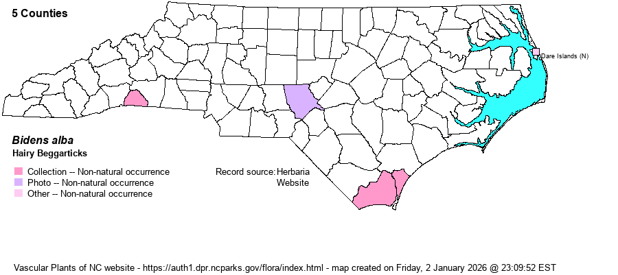 | Taxonomic Comments | Weakley (2020) lists var. radiata as the taxon present in NC. A number of references name this species as B. pilosa. Technically, the name pilosa has priority, but we prefer to use alba as it recalls the main feature of the plant and is the one used by Weakley as occurring in NC.