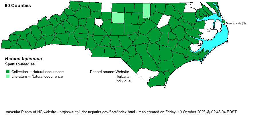 Identification | Spanish-needles is readily identified by its black, elongate, pronged fruits, 7-15 mm long. As in other beggarticks (Bidens spp.) the fruits are awned, in this case with 3-4 awns (vs. 2 in most of our species). Also unusual are the short (or absent) ray florets (vs. prominent in most our species). Thus, the flowers may appear to lack rays. Most people are familiar with this weedy species by getting the numerous "barbs" stuck into their pants when brushing up against the plants. | |