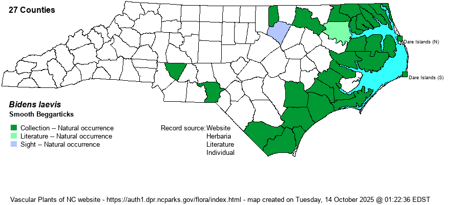 Identification | Smooth Beggarticks is our showiest Bidens species, with ray florets 17 mm or more long (vs. 15 mm or less in Nodding Bur-marigold [B. cernua]). The leaves are not dissected, as they are in Bearded Beggarticks (B. aristosa), and plants are shorter (mostly 1-2 feet tall vs. 2-4 feet tall). | |