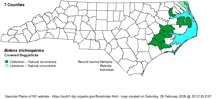 | Identification | Crowned Beggarticks is a tall (2-4 feet or more) and very slender (yet showy) plant. The leaves are divided into 3 or 5 (or 7) linear segments that may be hard to see amid surrounding vegetation. Heads are solitary on long stalks which arch outward, and are showy with bright yellow ray florets and orange-yellow disk florets; flowers reach at least 2 inches across. The skinny, usually untoothed or unlobed leaf segments separate it from other beggarticks, especially from B. mitis, another rare Bidens that has a similar range and habitat in NC. | |