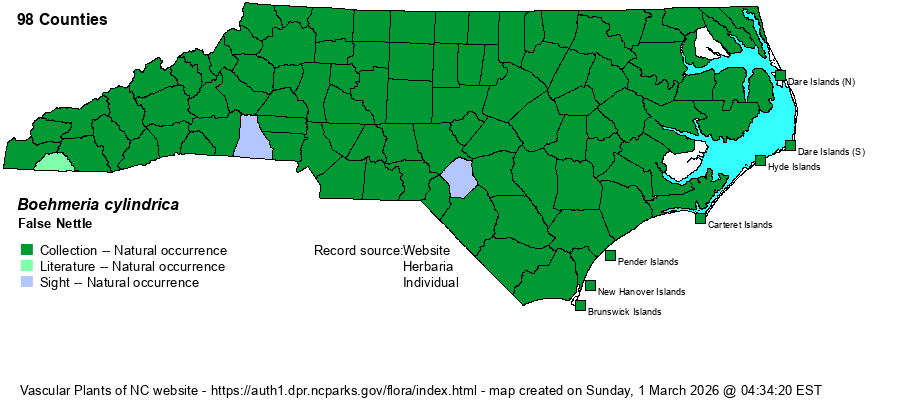 | Identification | This is a very familiar wetland herb seen many times during the year. It grows to about 2-2.5 feet tall, usually unbranched, with scattered opposite leaves. Each leaf has a long petiole (often to 2 inches), and the blade is ovate, with small serrations along the margins. Each blade is 3-4 inches long and 2-3 inches wide, with 3 main veins, the outer curved inside the leaf margins. The tiny flowers grow in dense spikes from mid- and upper leaf axils, each spike about 2-3 inches long. The widespread Pilea pumila is somewhat similar, but it has shiny upper surfaces of the leaves (whereas Boehmeria leaves are dull above), usually more deeply serrated leaves, and the flower clusters are from axils but are branched and shorter than the spiky clusters in Boehmeria. Laportea canadensis has stinging hairs along the stem, alternate leaves, and terminal flower clusters. | |