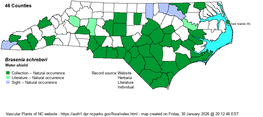 | Identification | This is a very easily identified floating plant, such that even a caveman can identify it! It has floating leaves, several per plant; these leaves are elliptical in shape with rounded ends, and roughly 2-3 inches long and half as wide. Each leaf has a peltate stem attachment from below; that is, there is a small indention on the upper leaf surface where the underwater stem attaches to the bottom of the leaf. The flowers are also unique -- this is a monotypic genus -- as each plant has a single stem emerging from the water surface for about 2-3 inches, topped by a fairly small, dull (or watery) purplish flower, with 3 or 4 petals, that is about 3/4-inch across. The many stamens are bright red, as well; these may catch your attention more than the color of the petals, especially as the petals are recurved to expose the stamens and their bright color. Hardly any other aquatic/floating plant has purple flowers, but neither does any have peltate elliptic leaves. Biologists often run into this species frequently in the Coastal Plain, such as around the shores of beaver ponds or millponds; usually many dozens of plants dot the waters close to shore. If you are inclined to pull a plant out of the water, you can get hold of "botanical snot", the thick and slimy substance that coats much of the underwater parts of the plant! | |