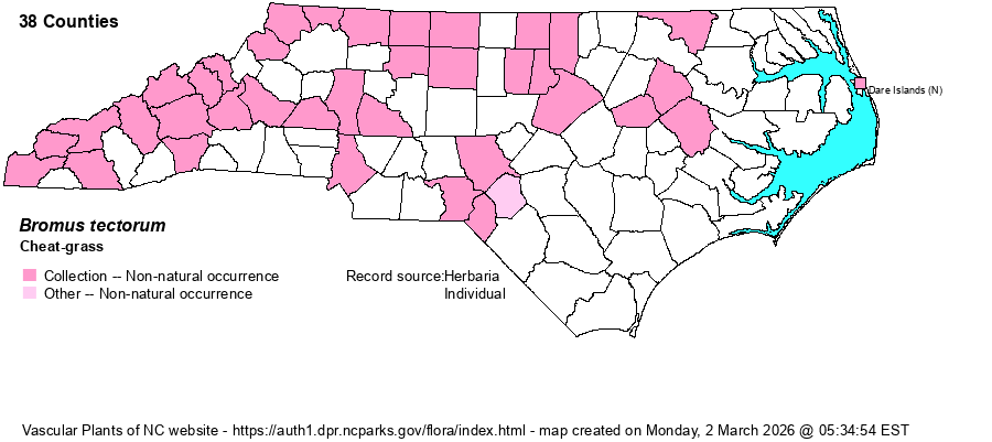 | Identification | Cheat-grass is closely similar to B. sterilis, and both have drooping spikelets when mature. However, Cheat-grass has shorter awns and glumes -- see Weakley (2025) for measurements. | |