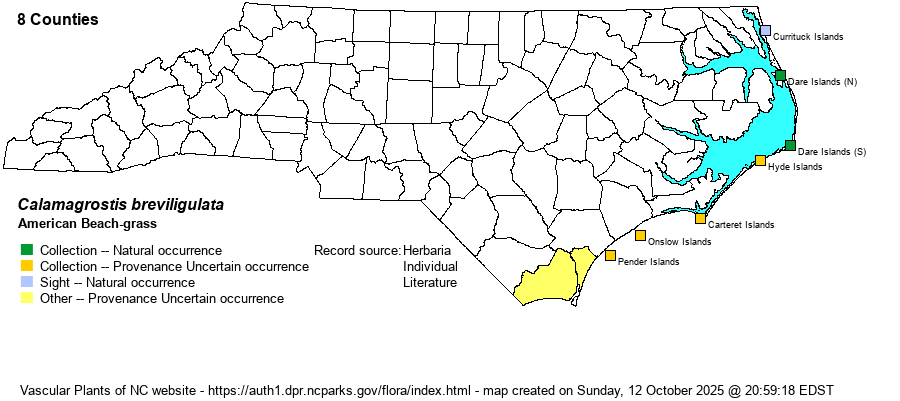 Distribution | Outer Banks and other barrier islands only. Native populations occur south to Oregon Inlet, and perhaps to Cape Hatteras; but its status southward is unclear, as it was extensively planted to stabilize dunes. The website editors have mapped records from Hyde County southward as Provenance Uncertain.