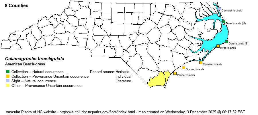 | Distribution | Outer Banks and other barrier islands only. Native populations occur south to Oregon Inlet, and perhaps to Cape Hatteras; but its status southward is unclear, as it was extensively planted to stabilize dunes. The website editors have mapped records from Hyde County southward as Provenance Uncertain.
