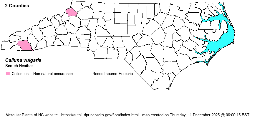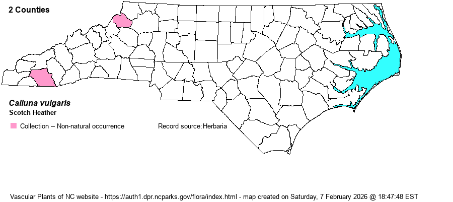 | Identification | Scotch Heather is a perennial, short shrub 1-2 feet tall. In gestalt it resembles a mini-juniper or cedar. The branches are strongly ascending and clothed with very short, linear, blunt leaves. In flower it is essentially covered with small, pink, bell-shaped flowers. It is unlikely to be confused with any other NC plant. | |