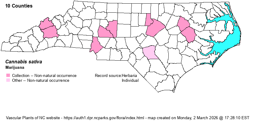 | Identification | Marijuana is familiar to most people as a tall to very tall, rangey herbaceous plant with leaves deeply palmately divided into 3-9 serrate, tapered leaflets. Be careful if and when you stumble onto a plant or a population; you don't want to be spotted by the person who planted them. Certainly if you see a sizable number of plants, you should contact authorities -- assuming you were on public or otherwise protected private property. | |