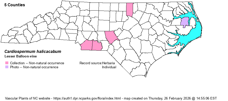 | Identification | Lesser Balloon-vine is an odd but readily identified plant. It is a scrambler or low climber; the leaves are well-spaced, 3-parted, each leaflet with a few bold teeth on the margins. The flowers are tiny, a few together on a long stalk, producing large globular, puffy fruits with a papery texture. | |