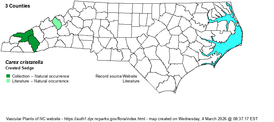 | Abundance | Very rare; two counties with specimens -- both historical, but a CVS plot record from 2009 in Yancey County -- if correctly identified. This is a State Special Concern species. | |