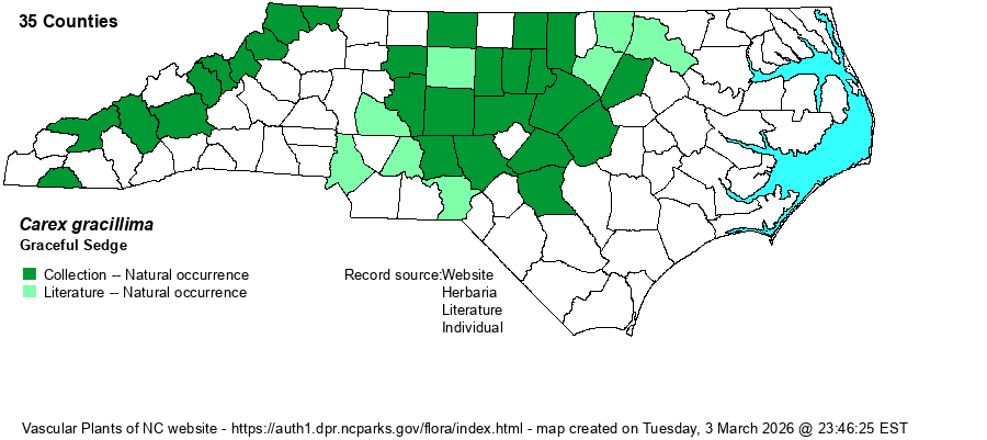 | Identification | A number of sedges possess slender, arching or drooping spikes, such as C. debilis, C. flexuosa, C. allegheniensis, C. aestivalis, C. roanensis, and C. venusta. Carex gracillima is distinct in its combination of dark red-purple base of the plant, beakless (or nearly so) perigynia, and glabrous leaf sheaths. | |