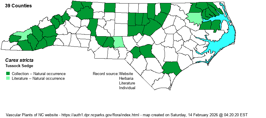 The genus Carex is the largest in North America, and among the largest in the world. In temperate and boreal regions, Carex is often the dominant or co-dominant ground layer in many habitats. Seeds (achenes) are valuable food for birds and small mammals, while foliage is used by birds and mammals to make nests and as food by mammals. Species of Carex often look vastly different from one another -- spikes erect vs. drooping, tiny inflorescence vs. whopping, culms leafy vs. naked, perigynia beaked vs. beakless, stems densely bunched vs. single, etc. The genus has been divided into many sections (or groups), based on shared characters; some taxonomists have suggested that these be different genera, but that proves unworkable (so far). All Carex share the feature of a perigynium (an outer covering) which completely surrounds the achene (seed). This covering may fit tightly or loosely (like a small bladder), depending on which group or species. Details of perigynia shape, ornamentation, presence and size of beak, number of striations (or veins) are all important ID features. In recent years Rob Naczi and colleagues have stressed the importance of arrangement of perigynia -- whether spiral (3+ ranks) or distichous (2-ranked) -- and have named a number of new species as well as split off some older synonyms. Therefore, RAB's (1968) key, excellent for its time, can only be used in a general way today. Members of some sections of Carex are difficult to key out (notably Ovales, Laxiflorae, Griseae); this is in part due to variation among individuals of a species, or failings of the key. FNA has drawings of most species and some species may be found in two or more places within a key, to acount for variability. New species to NC, and new to science(!), continue to be found in NC. | |