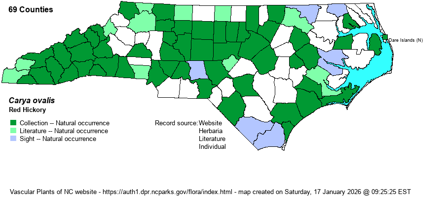 | Distribution | Essentially statewide, but as this is a difficult species to identify for many biologists, it has been much less collected for documentation than have Pignut (C. glabra) and Mockernut (C. tomentosa) hickories. Perhaps occurs in nearly all 100 counties, but possibly absent in some far eastern counties and the Sandhills proper. Sizable "holes" in the range elsewhere, such as the northwestern Piedmont and south-central Coastal Plain, are probably not real.