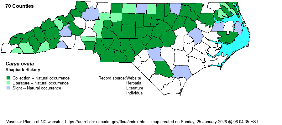 | Abundance | Fairly common to frequent, and locally common in some areas of rich soil, in the lower Mountains, Piedmont, in the Roanoke River floodplain in the northern Coastal Plain, and the Cape Fear River in the southern Coastal Plain. Much less numerous than Mockernut (C. tomentosa) and Pignut (C. glabra) hickories in NC, but perhaps seen as frequently as Bitternut Hickory (C. cordiformis). | |
