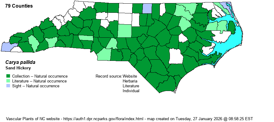 | Abundance | Common in the Sandhills and most of the southeastern part of the Coastal Plain. Infrequent to fairly common in the northern Coastal Plain and the extreme eastern Piedmont. Generally uncommon to infrequent in the western half of the state. Probably the most numerous hickory in the southern Coastal Plain, especially in sandy soil. | |