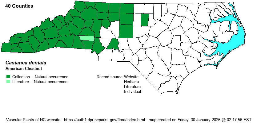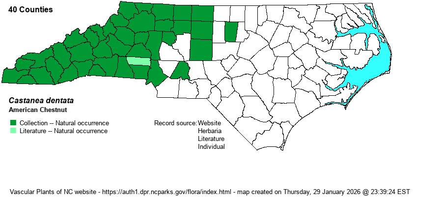 | Abundance | Formerly, before the chestnut blight hit in the 1920’s-1930’s, it was a very common and dominant montane tree. Today, it is still common in the Mountains, but only as stump sprouts and saplings; seldom reaches the age to produce fruit before dying. Fairly common in the foothills, but uncommon in the lowlands of the central Piedmont, to rare along the eastern edge. As in the Mountains, Piedmont individuals are almost only seen as stump sprouts and very young trees. In late 2022, the NCNHP added the species to its Watch List at W5, strongly declining, and they moved the State Rank up to S3 (from S4). Note that NatureServe also moved its Global Rank from G4 to now G3, indicating a continued decline. | |
