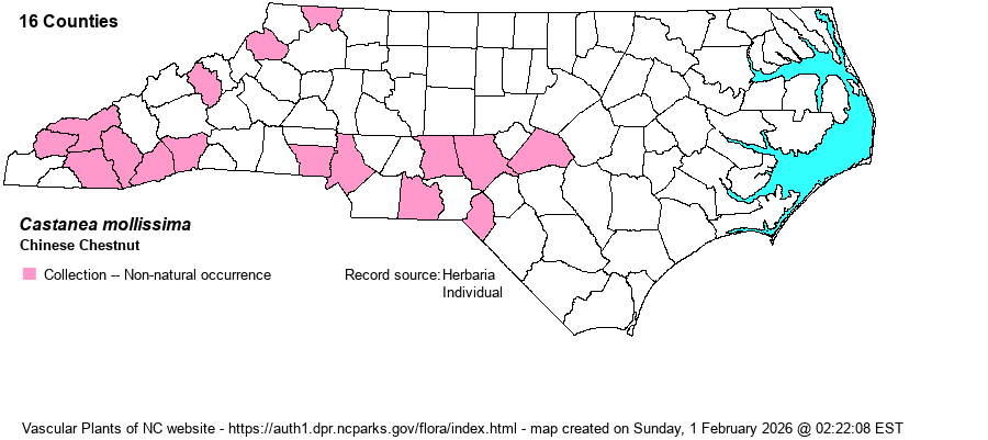 | Identification | Chinese Chestnut is very similar to American Chestnut, but the leaf undersides are rather tomentose and are short-pointed (vs. rather glabrous and acuminate in American Chestnut). | |