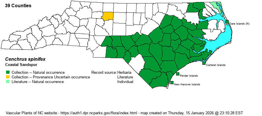 | Taxonomic Comments | A synonym is Cenchrus incertus. The name C. spinifex has priority over C. incertus. Ward (2010b) argued that the name C. spinifex is very uncertainly applied to our species and should not be taken up. Verloove & Sánchez Gullón (2012) disagreed: "the type of the latter name [C. spinifex] and states that it definitely refers to the taxon traditionally called C. incertus" (Weakley 2025).