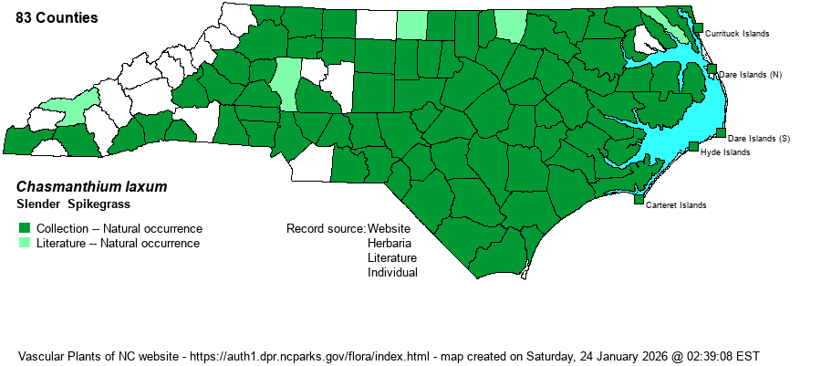 | Other Common Name(s) | Slender Woodoats. Most references use "woodoats" for many members of Chasmanthium; however, NatureServe and Weakley (2025) use "spikegrass" as the main group name -- for species with narrow, spike-like inflorescences. In general, "oats" as part of the common name is best used for species with very large and flattened spikelets, as in C. latifolium [River Oats] and Uniola paniculata [Sea Oats]. | |
