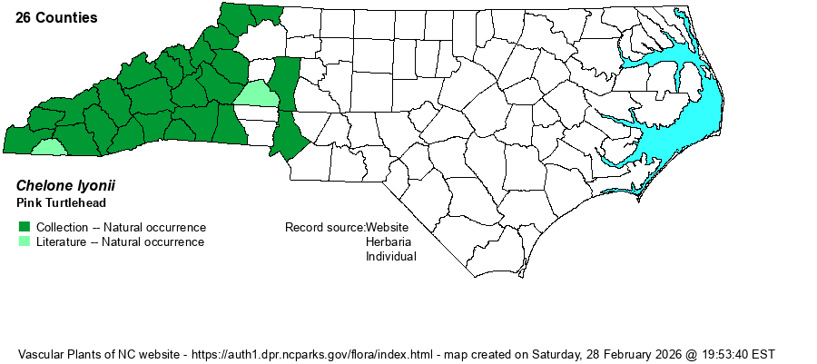 | Habitat | This is a species of a great array of habitats with wet or damp ground, but mostly where shaded or in partial shade, usually with some slope. It grows in Rich Cove Forests (but usually along seepages), into Spruce-fir Forests, in shrub and grass balds where there is seepage, on damp to wet crevices in rocks and cliffs, and along streambanks. Though C. glabra is more widespread in the mountains at the lower elevations, C. lyonii is the primary turtlehead species of the middle and higher elevations, especially in sloping ground. |